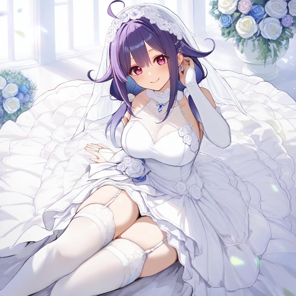 Illustration of an anime-style young woman with purple hair and red eyes wearing an elegant white wedding dress with floral details. She is seated in a softly lit room with floral arrangements visible in the background, showcasing stockings and a bridal veil.