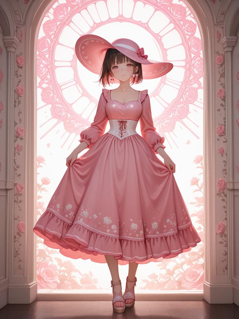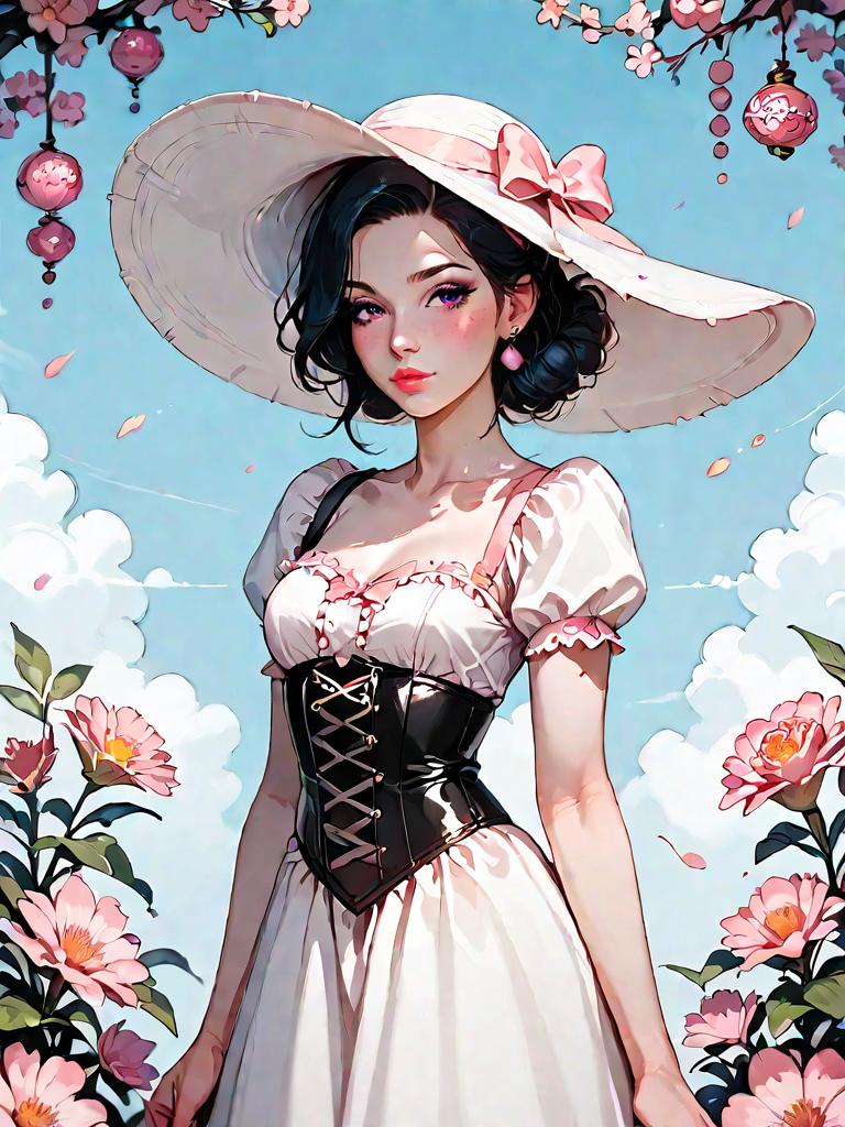 Digital illustration of a young woman wearing a corset-style midi dress with a fitted silhouette and blush pink accents. The dress features a sweetheart neckline, embroidered floral patterns, and a tulle overlay with a cinched waist. She accessorizes with an oversized sun hat adorned with a bow, pink pearl earrings, and strappy sandals. The background includes a blue sky with fluffy clouds and blooming pink flowers, giving a soft and delicate atmosphere.