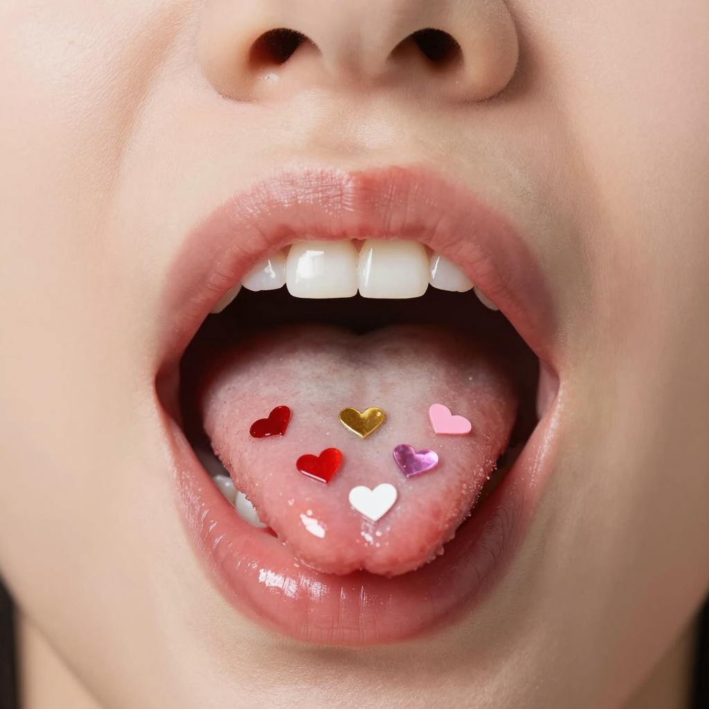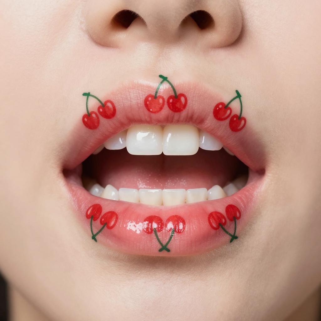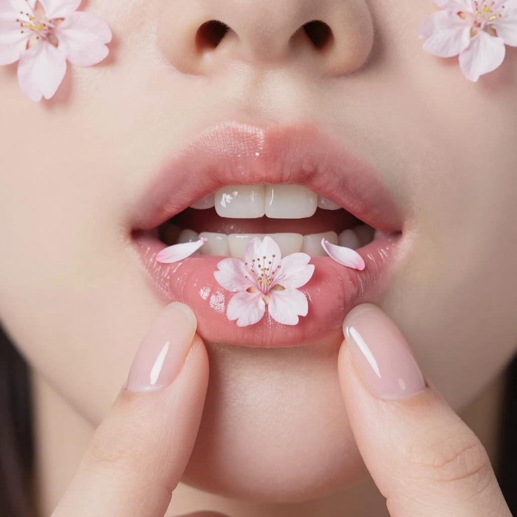 Close-up photograph of a person's lips. Pink lips with white floral decorations on the upper and lower lips. Teeth visible between the lips. Light skin. Small white flowers with yellow centers, some with transparent, glossy ure.