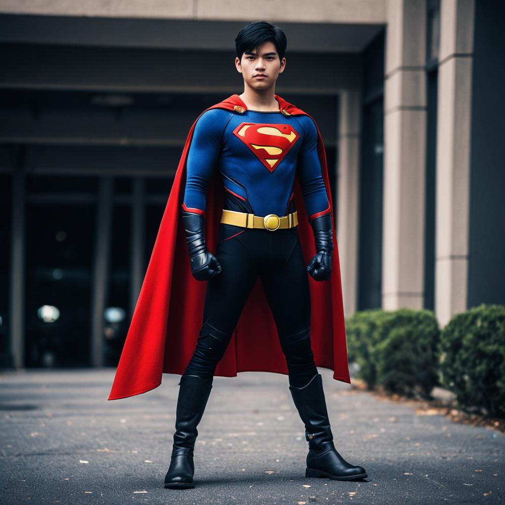 Superboy suit costume,1boy,male focus,cape,red cape,solo,muscular,superhero,boots,full body,bodysuit,short hair,indoors,standing,closed mouth,muscular male,blurry background,blurry,covered abs,black hair