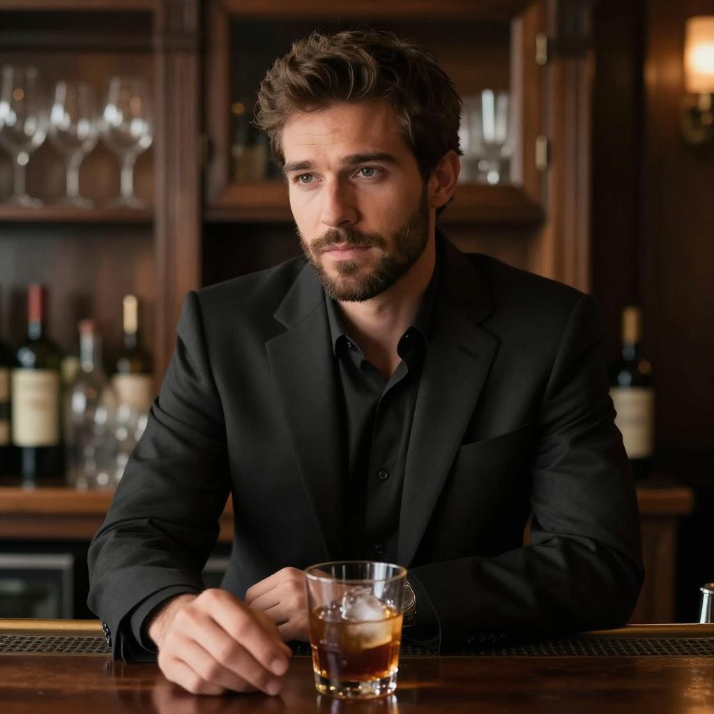 Photograph of a white man with short brown hair, wearing a white polo shirt, leaning on a table with his right arm. He holds a glass of white wine in his left hand, looking slightly to the side with a subtle smile. Background features a blurred, warmly lit lamp.