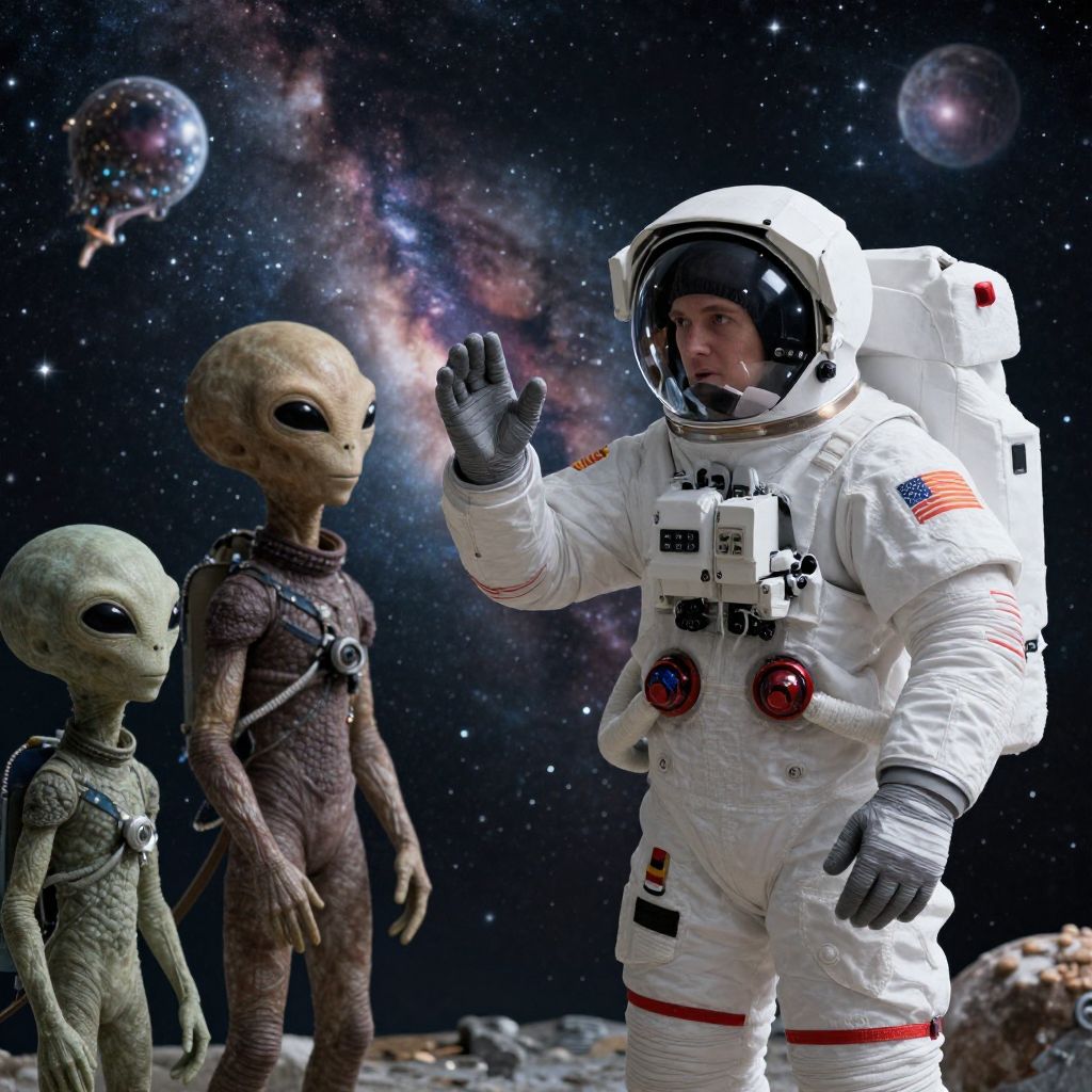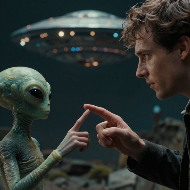 Soft Edges guy makes contact by touching fingers with a little Spielberg style alien in a dark field with a flying saucer in the background, realistic, hyper detailed, cinematic 8k — v 5,