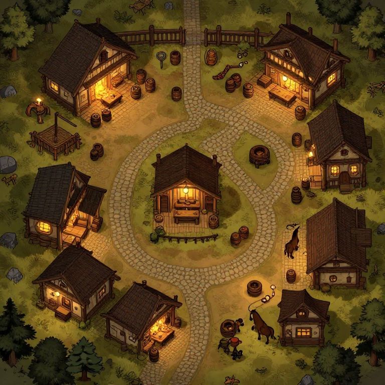 A detailed, digital illustration of a quaint, illuminated village viewed from above at night. The village features seven wooden houses with warm yellow-orange lights glowing through their windows, surrounded by cobblestone paths. Barrel-like structures and small wooden fences are scattered around the houses. The central house is the focal point, with the others arranged symmetrically. The lush green grass contrasts with the dark, shadowy trees at the edges. The style is reminiscent of traditional European folk art, with rich, textured details and a cozy, inviting atmosphere.