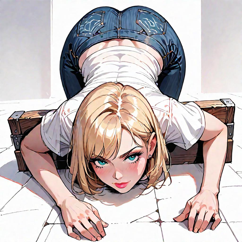 Score_9, score_8_up, score_7_up, score_6_up, score_5_up, score_4_up, source_anime, source_cartoon, line art, smooth lines, flat color, 1girl, metalstocks, top-down bottom up, blonde hair, white background, white shirt, shadow, barefoot, white floor, on floor, ass, denim pants, looking at viewer