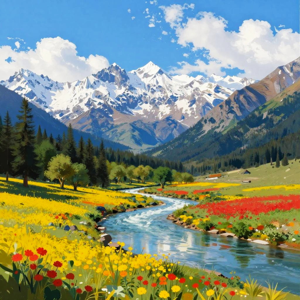 This vibrant digital painting showcases a stunning mountain landscape. Bright yellow and red meadows with lush green trees lead down to a serene blue river, reflecting the sky. Towering snow-capped mountains dominate the background under a vivid blue sky with fluffy white clouds. The colors are hyper-realistic, creating a picturesque and lively scene.