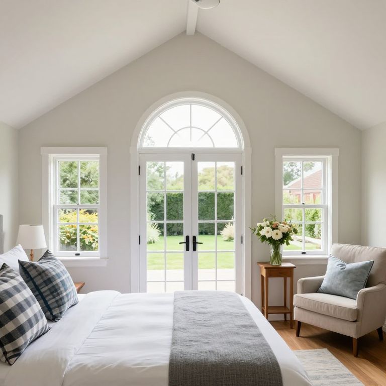 Cozy guest bedroom featuring a vaulted ceiling, arched French doors leading to a garden, flanked by two rectangular windows, with a neatly made bed adorned with checkered pillows and a gray throw, complemented by a wooden bedside table holding a vase of fresh flowers and a comfortable armchair with blue and white cushions.