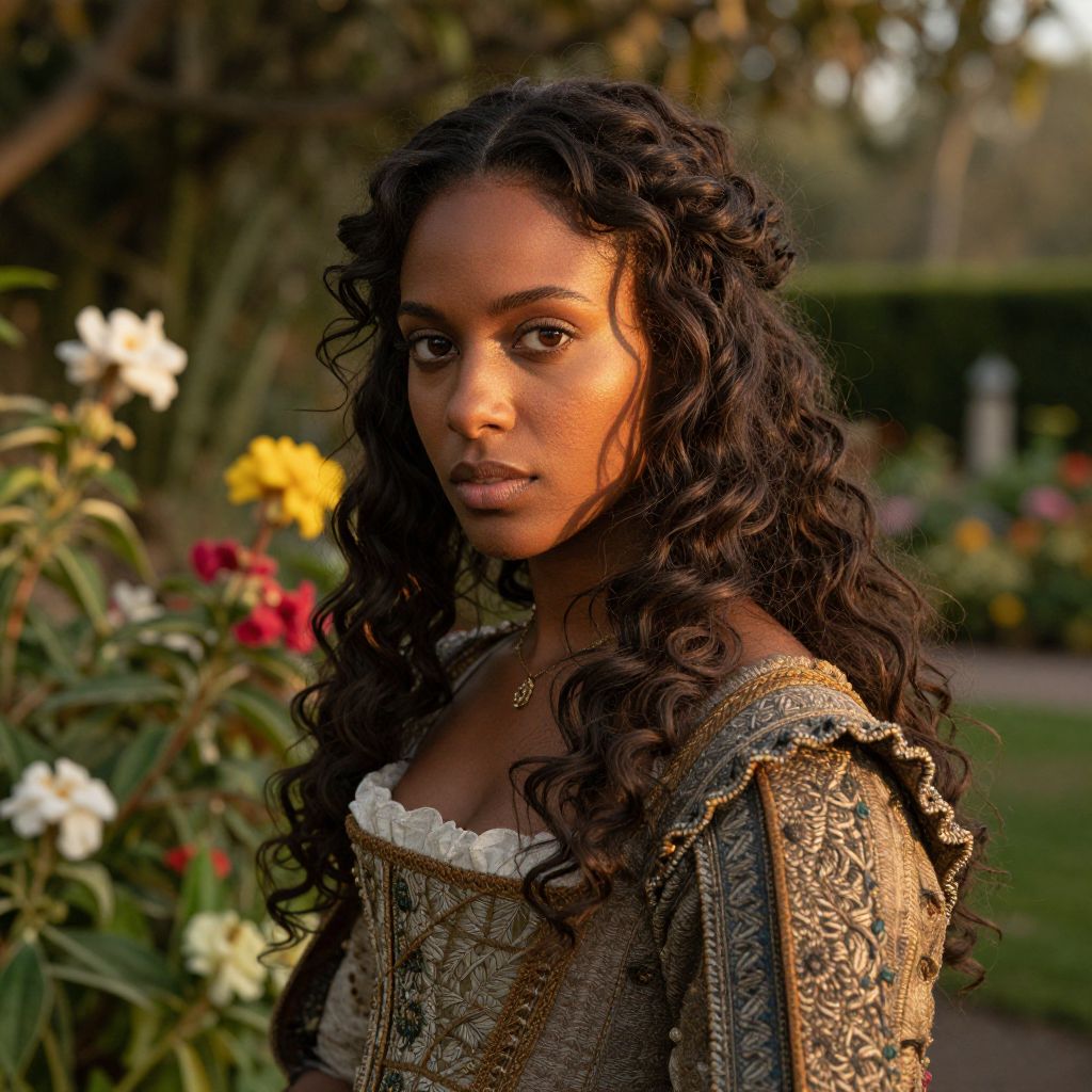 Photograph of a young Black woman with dark, curly hair cascading over her shoulders, standing in a garden. She wears an ornate, brown, patterned dress with intricate embroidery over a white lace top. Her dark brown eyes gaze directly at the camera with a serious expression. The background is blurred but shows vibrant flowers in red, yellow, and white, with green foliage and trees. The lighting is warm, highlighting her smooth, brown skin. A small, gold necklace with a pendant rests on her chest. The overall style is realistic with a shallow depth of field.