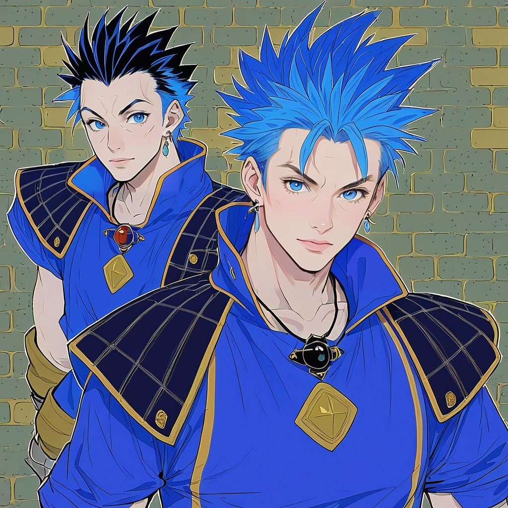 Camus (dq11), dragon quest, 1boy, blue eyes, short hair, spiked hair, blue hair, collarbone, fingerless gloves, long sleeves, earrings, necklace, by artist meeko, anime