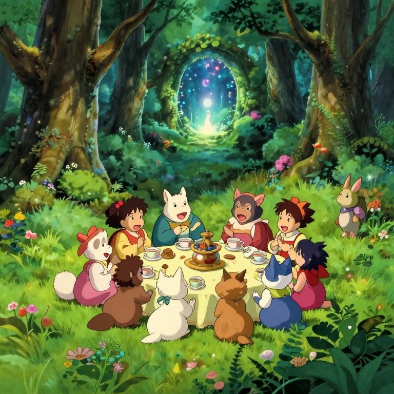 Depict an awe-inspiring aerial perspective of a verdant, enchanted forest, characterized by the enchanting visual style that harmoniously blends Studio Ghibli's vivid imagination and classic Disney animation's whimsy. In the foreground, discover a delightful tea party gathering various anthropomorphic woodland creatures engaged in lively conversations and laughter, while the background unveils an enigmatic magical portal emanating otherworldly light. This captivating scene skillfully intertwines joy, curiosity, and wonder through its harmonious blend of vibrant colors, intricate details, and dreamlike atmosphere, inviting viewers into a mesmerizing realm where fantasy and reality seamlessly converge.