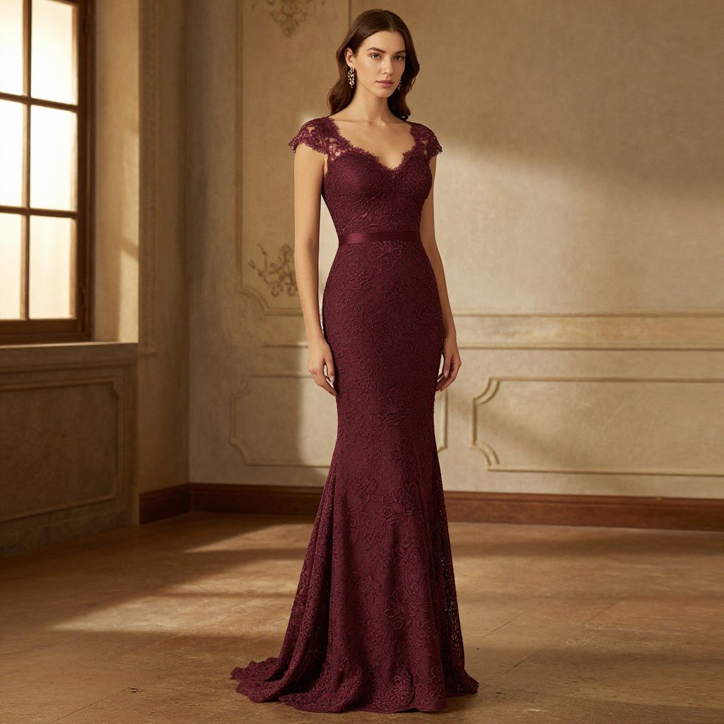 A woman elegantly showcases the Annabeth Lace Gown in Burgundy, featuring intricate lace detailing and a flowing silhouette against a vintage-inspired backdrop with golden-hour lighting, capturing the timeless beauty of high-definition fashion photography.