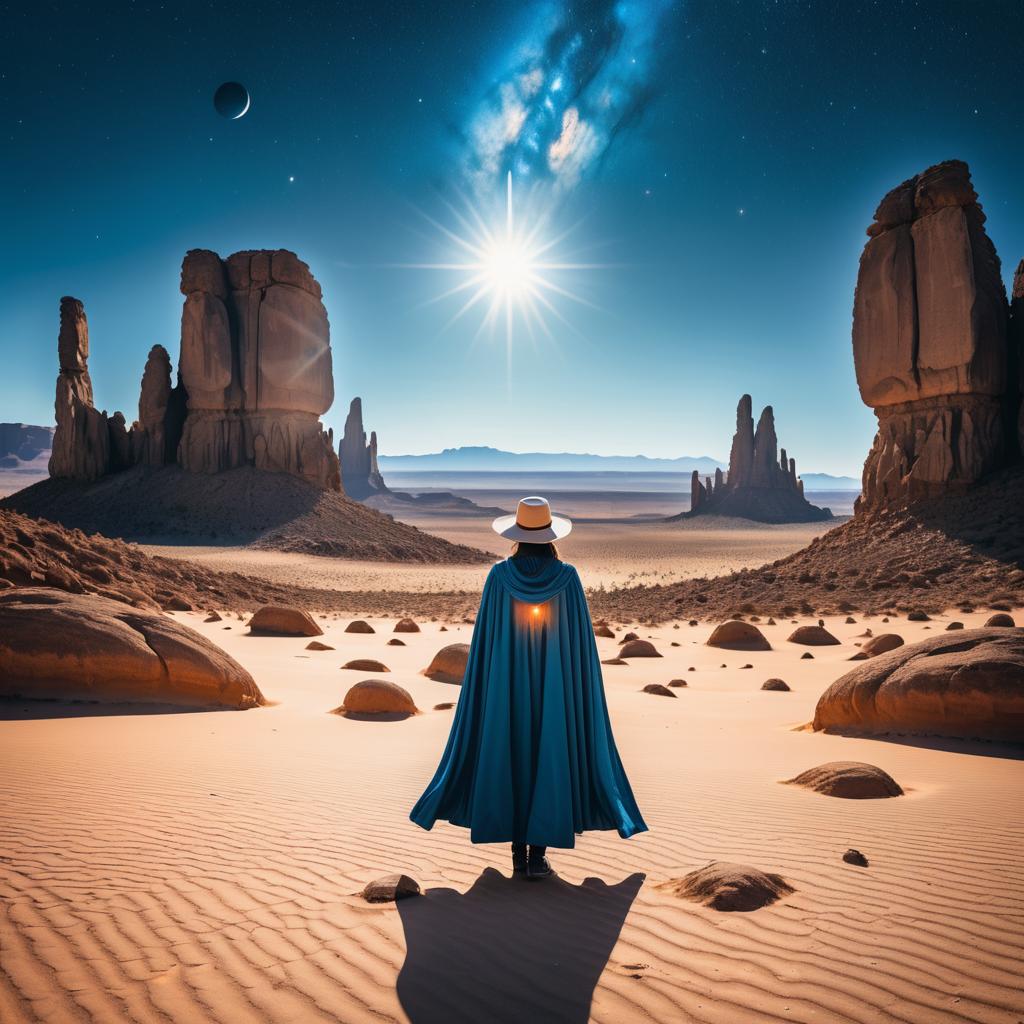 A lone figure wearing a wide-brimmed hat and a long blue cape stands on a rocky outcrop in a surreal desert landscape, gazing at two large suns on the horizon between towering rock formations, scattered reflective spheres lie on the ground, under a clear starry sky, soft warm orange and cool blue tones