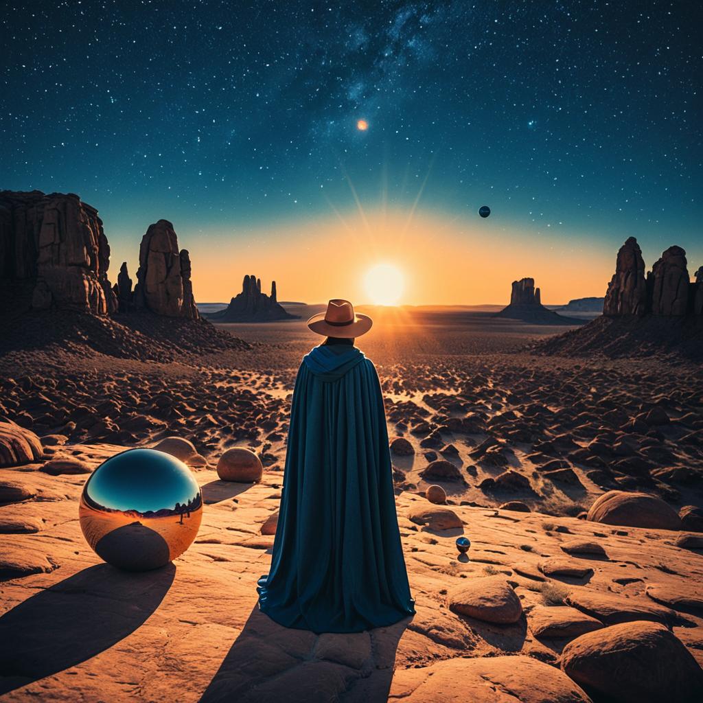 A lone figure wearing a wide-brimmed hat and a long blue cape stands on a rocky desert outcrop. The landscape features towering rock formations surrounding twin large suns setting on the horizon. Reflective metallic spheres are scattered on the ground, under a clear starry sky with cool blue and warm orange tones, creating a surreal and otherworldly atmosphere.