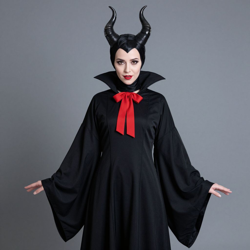Simple Maleficent Costume, maleficent in a black costume with horns and a red bow