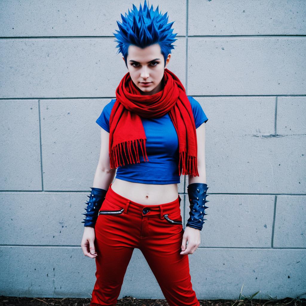Laharl cosplay costume outfit sexy cosplay blue spiky hair red eyes long red scarf bare midriff red pants