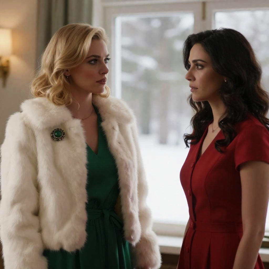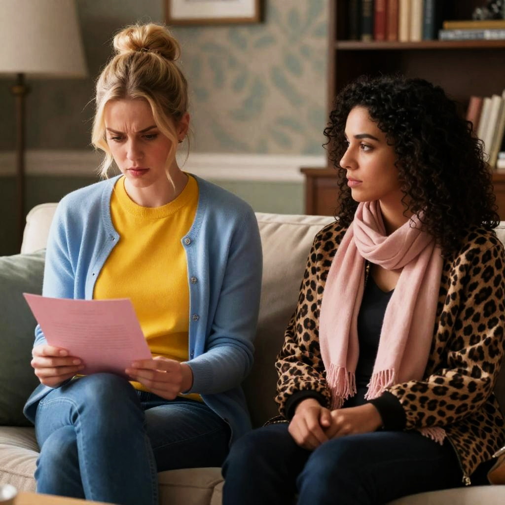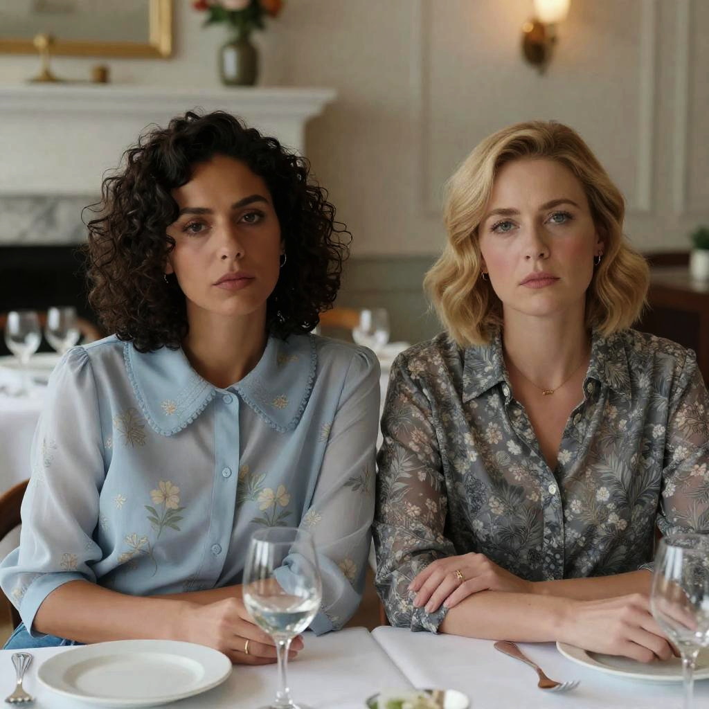 Photograph of two women sitting at a table in a restaurant. The woman on the left has curly dark hair, wears a light blue floral blouse with a large collar, and holds a glass. The woman on the right has short, wavy blonde hair, wears a grey floral blouse, and rests her hands on the table. Both have serious expressions. Background includes a marble fireplace and flowers. Glasses, plates, and silverware on the table.