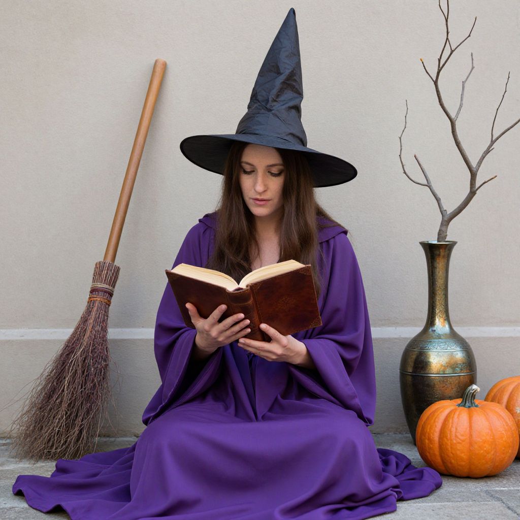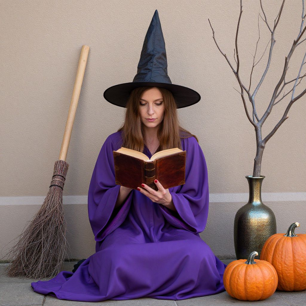 Woman engrossed in reading a leather-bound book while seated outdoors, wearing a flowing purple robe and a tall, pointed witch's hat, surrounded by a broomstick, two pumpkins, and a bronze vase containing a bare tree branch.