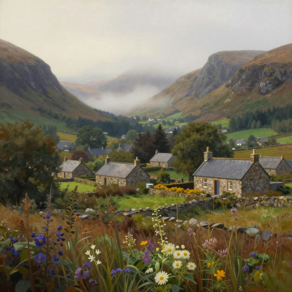 Sutherland town nestled in the Scottish Highlands, misty mountains surrounding ancient stone cottages, soft early morning light, wildflowers in the foreground, serene and mystical atmosphere, detailed landscape painting style