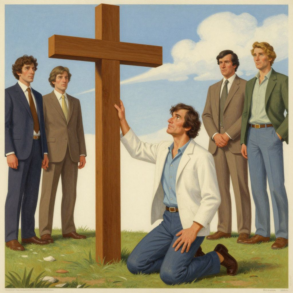 Illustration of five men in suits, one kneeling and touching a wooden cross, with a blue sky and grassy background.