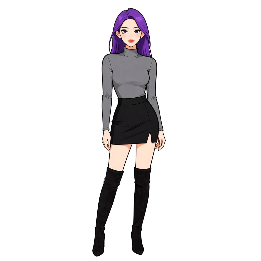 Woman with pretty face and pretty hair. Woman, modern minimalist, sleeveless black skater dress, high round neckline, fitted bodice, flared skirt above the knee, narrow belt with small buckle at the waist, opaque tights, platform Mary Jane shoes in glossy burgundy, hand holding a light-colored clutch, plain indoor setting with light wood floors and white wall. --sref 1467