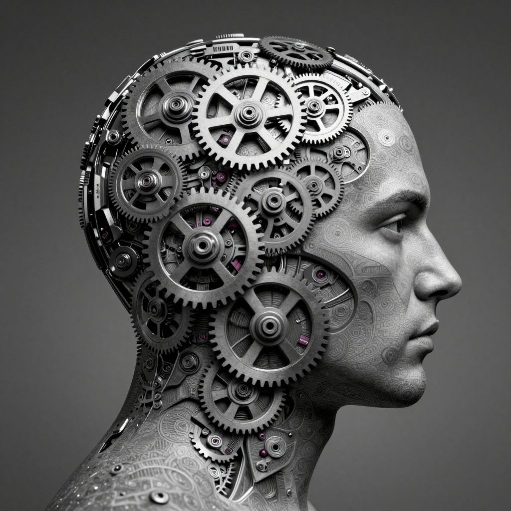 Digital artwork of a silver human head profile with intricate gears and cogs replacing the brain, set against a dark gray gradient background.