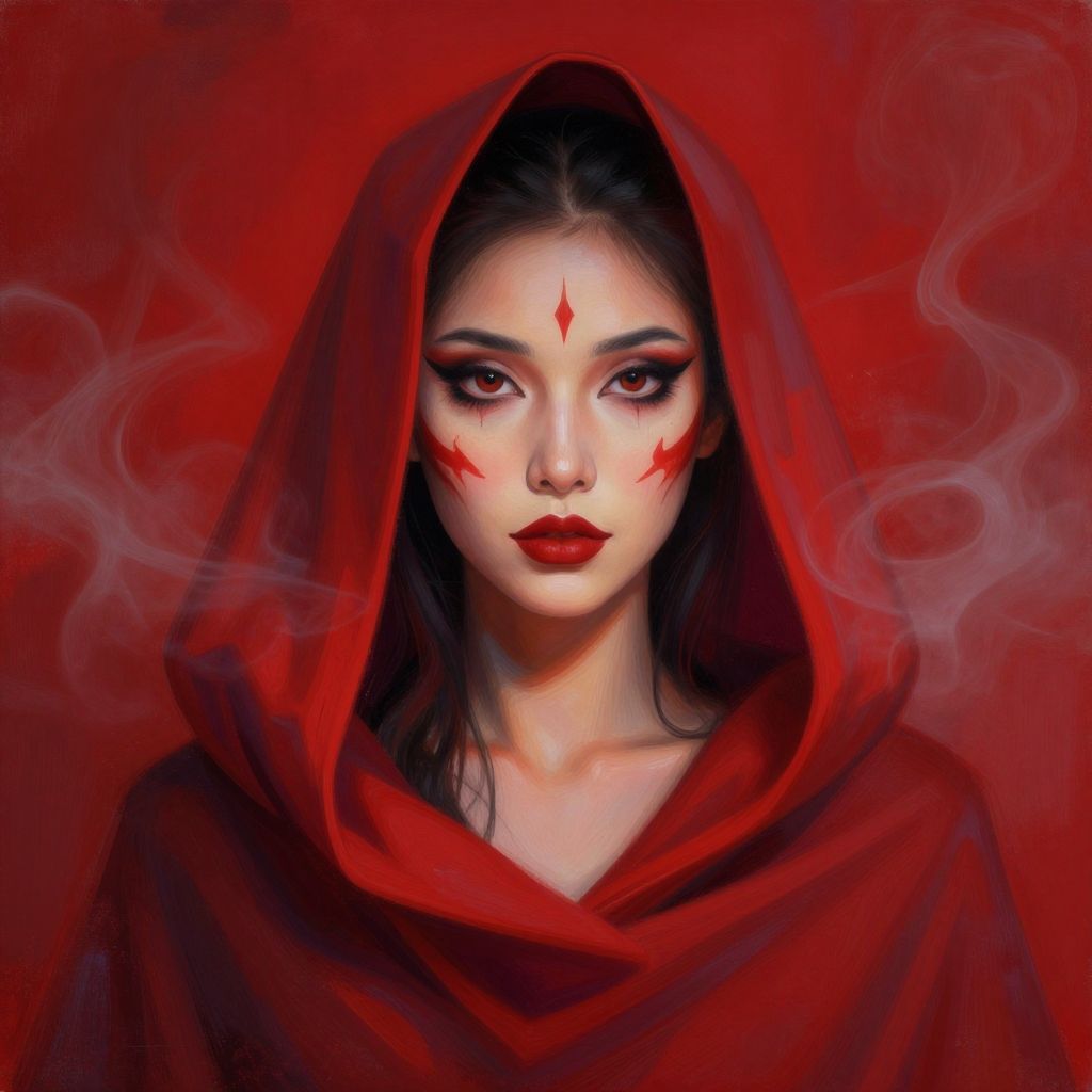Digital painting of a mysterious woman with pale skin, red hood, red face markings, smoky background, and intense red eyes.
