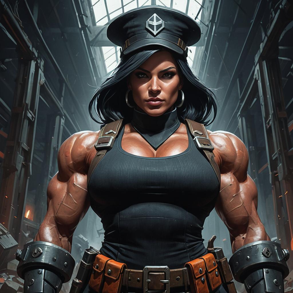 Portrait of a muscular female bodybuilder dressed in a dark dieselpunk military outfit with a peaked cap, black tank top, and heavy metal wrist guards. The woman has dark hair, strong defined facial features, and a confident intense expression. The background shows an industrial or warehouse setting with diffused natural light from above, emphasizing a fantasy and militaristic dieselpunk aesthetic inspired by Team Fortress 2 styling.