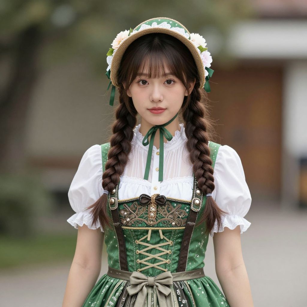 Photograph of a young Asian woman with fair skin and long, dark brown hair styled in two braids. She wears a traditional German dirndl dress with a green and gold patterned bodice, white puffed sleeves, and a green ribbon bow at the neck. The dress is cinched with white lace-up laces at the front. She also has a green headband adorned with white flowers. Her large, dark eyes and subtle pink lips add to her delicate appearance. The background is softly blurred, showing greenery and a wooden structure. The overall scene has a crisp, natural light, highlighting the textures and colors of her outfit.