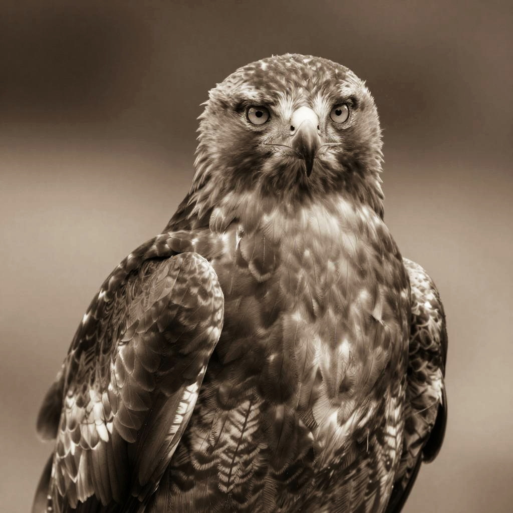 Highly detailed portrait of a majestic red-tailed hawk in sepia brown tone, inspired by Robert Bateman, Charley Harper, Walton Ford.