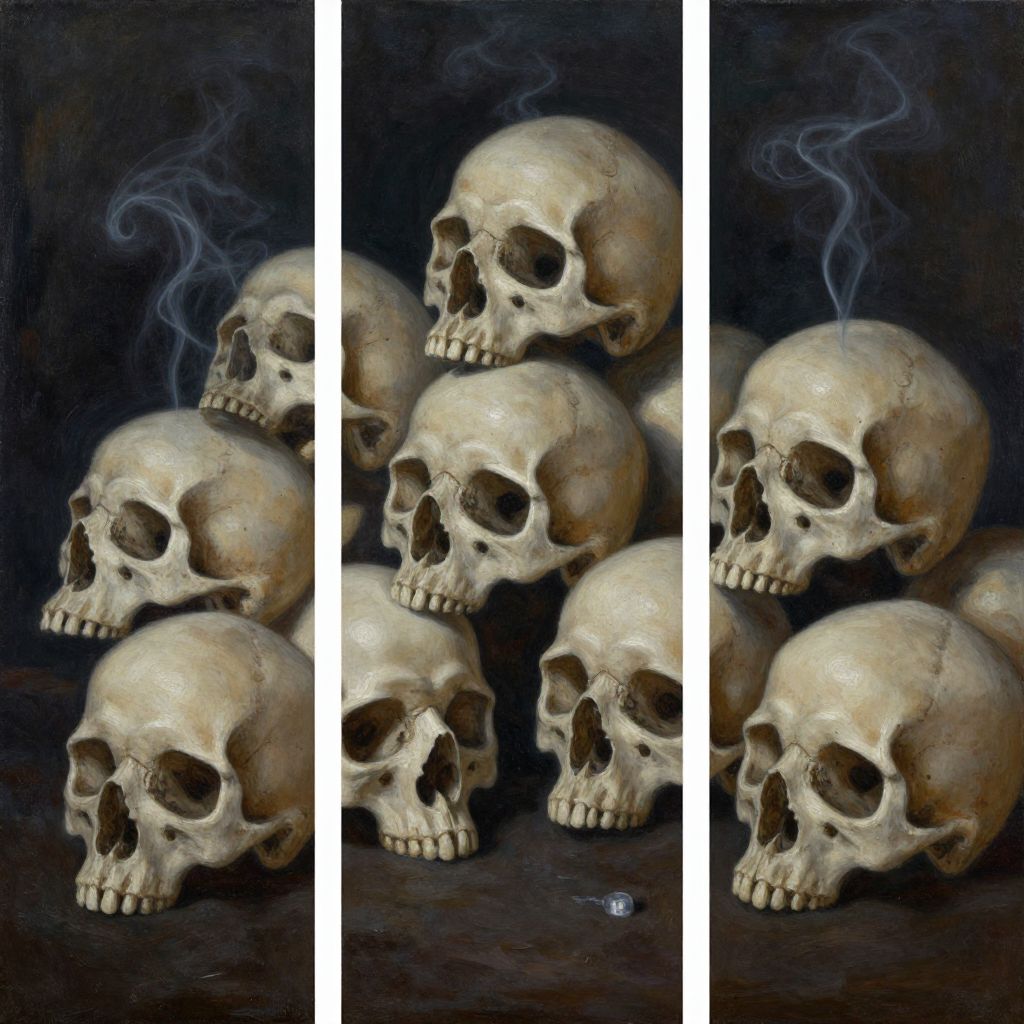Natural triptych oil painting of many human skulls juxtaposed together, bone, creamy, dark, moody, spooky, candle light, cool glowing background, hazy whisks of smoke,