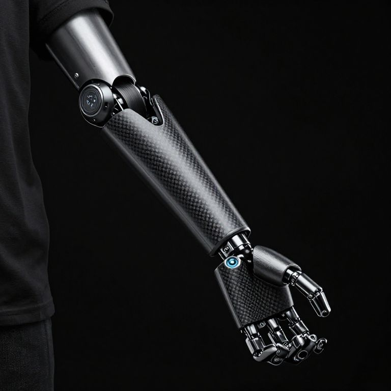 Photograph of a futuristic, metallic prosthetic arm with carbon fiber texture, illuminated against a black background, showcasing intricate mechanical joints and glowing blue accents.