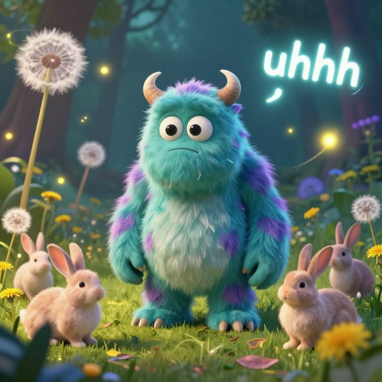 The dumbest, goofiest looking monster you can imagine stares blankly while bunnies frolic around him, fireflies flit in the ethereal proximity, dandelions bloom in groves and mystical energy ebbs, swirls and flows in the atmosphere, The monster's only thought is \"uhhh\