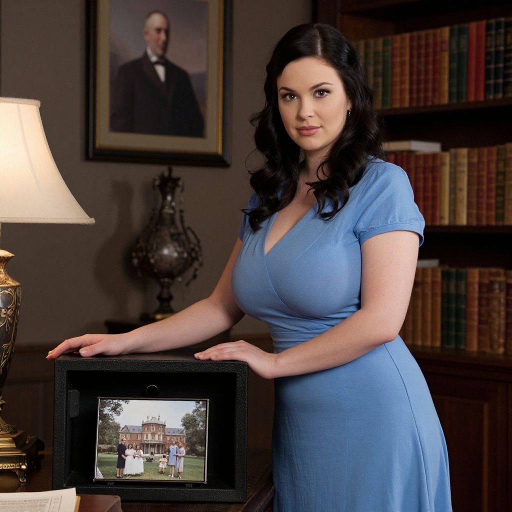 In a softly lit, dim-lit study filled with antique books and old family portraits, a woman in her late twenties with dark wavy hair and a calm, composed face wears a simple blue dress, her fingers resting on a hidden safe under a desk — a single photograph of a family estate is visible, revealing her true wealth beneath the plain clothes, suggesting she’s just begun her journey away from her legacy.. The woman has big tits and cute face