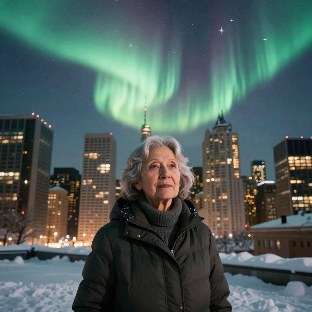 Realistic photo.Clone Stamp an elderly woman in a megalopolis after 100 years, surrounded by snow and aurora, with countless skyscrapers and twinkling stars above. realistic photo