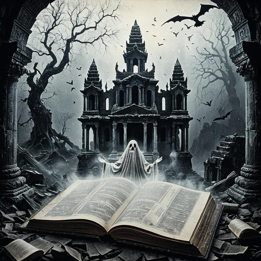 Phantom ship with burning sails, dark stormy sea with jagged rocks and lightning, dark surrealism, dark fantasy, intricate details.