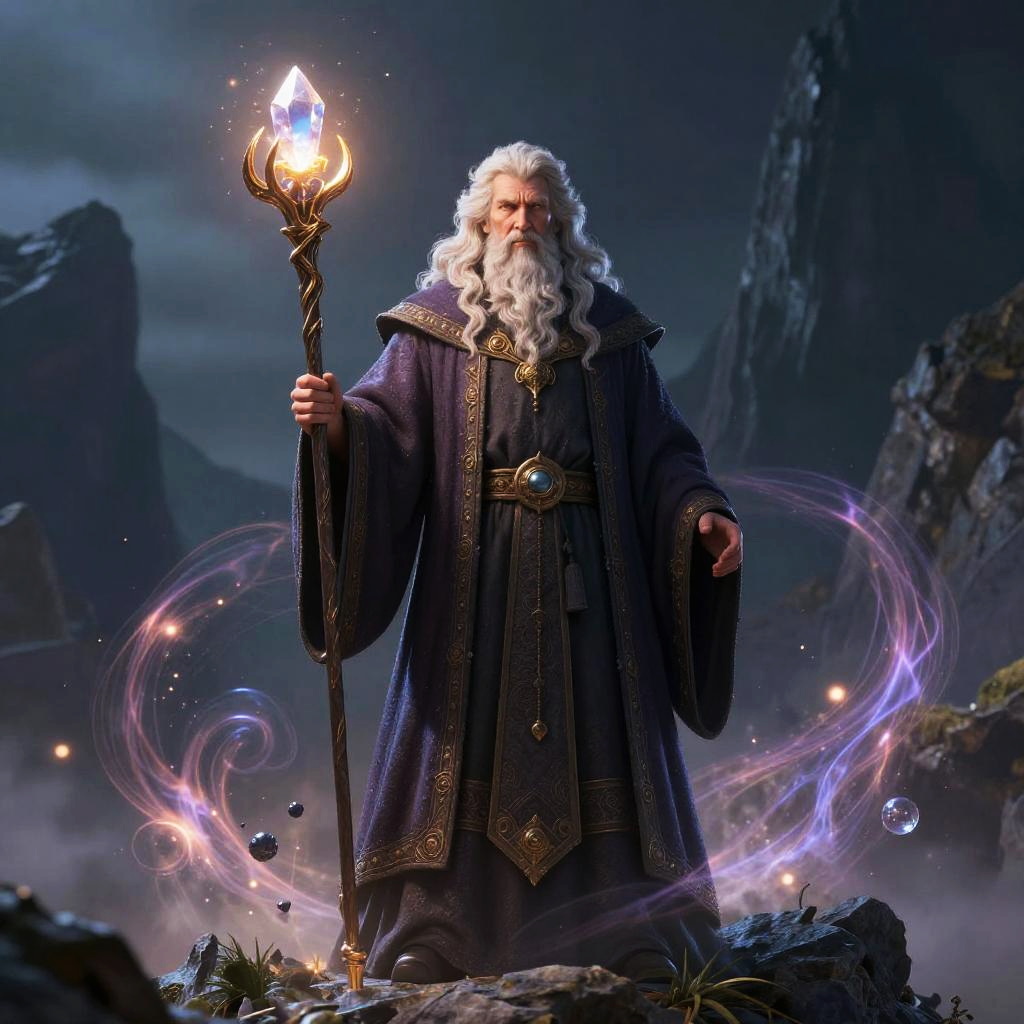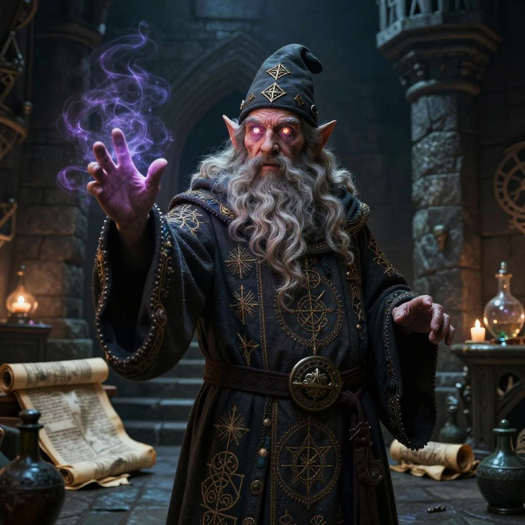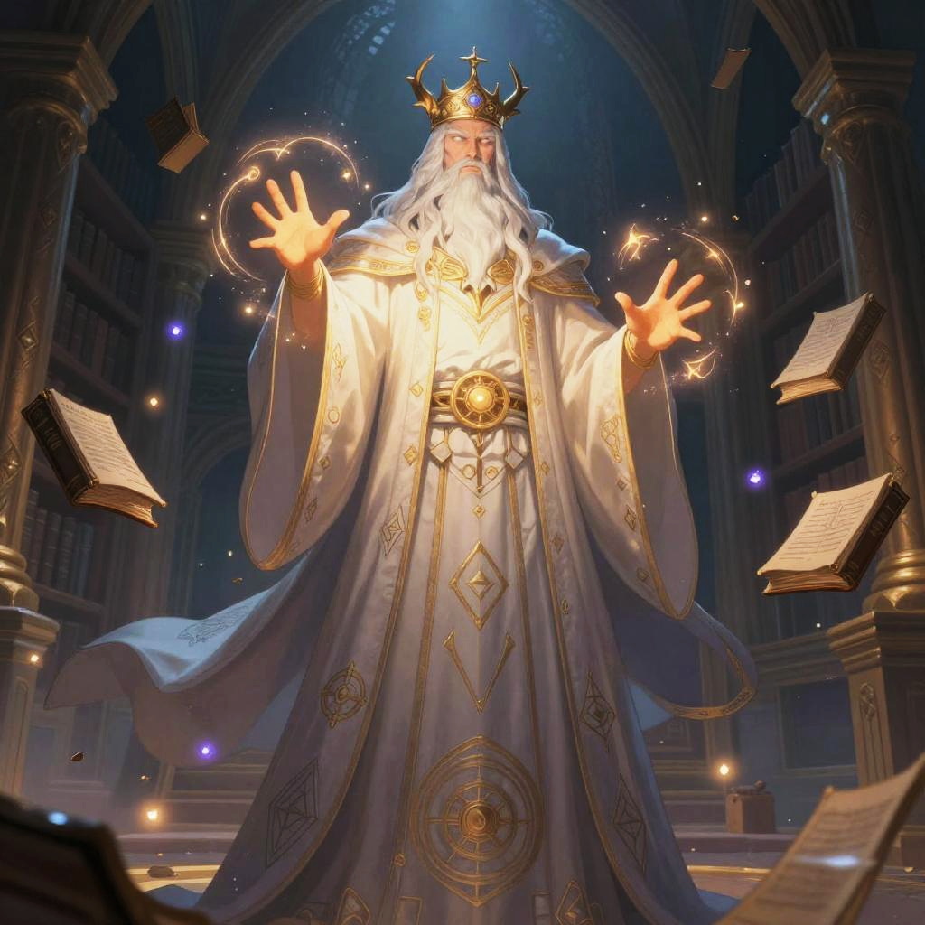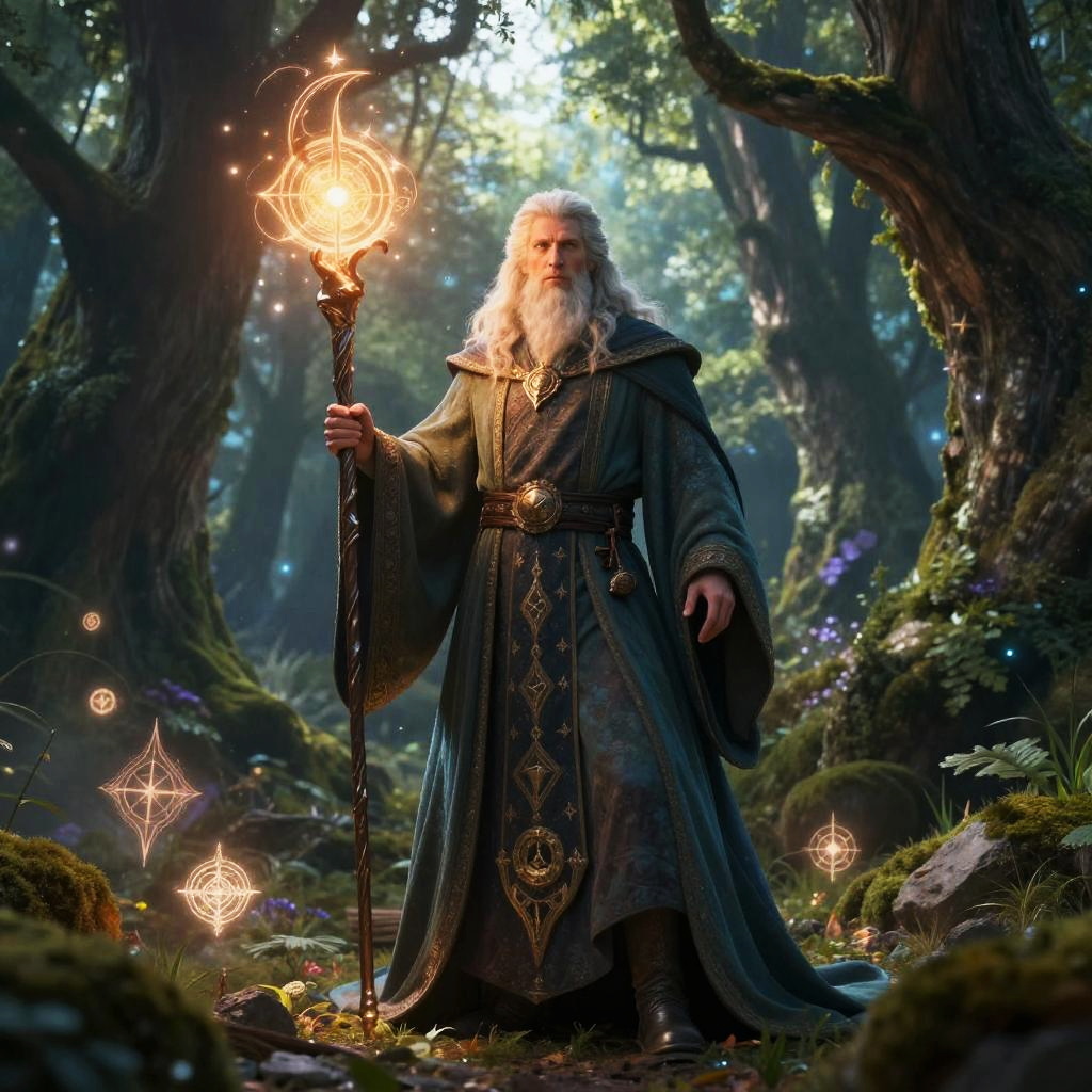 Elf AI art featuring a wise elven mage casting a powerful spell in a glowing rune circle, long robes with intricate patterns, floating enchanted crystals around, set in an ancient enchanted library, vibrant colors and magical ambiance.