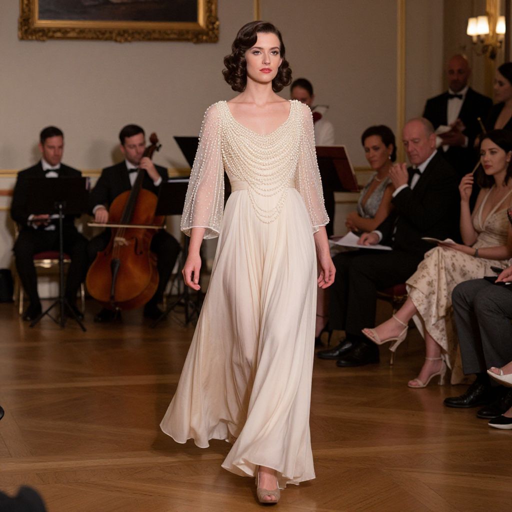 A photograph of a glamorous fashion show featuring a brunette woman with vintage curled hair, wearing a flowing, cream-colored gown adorned with pearl details and sheer sleeves. She's walking confidently down a polished wooden floor in a warmly lit ballroom, with a string quartet in the background and elegantly dressed onlookers. The scene exudes old Hollywood charm and sophistication.