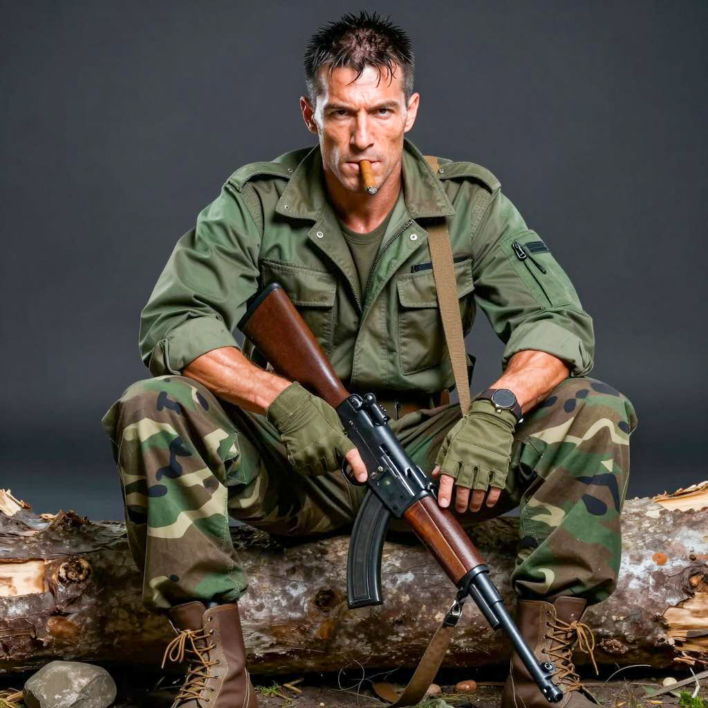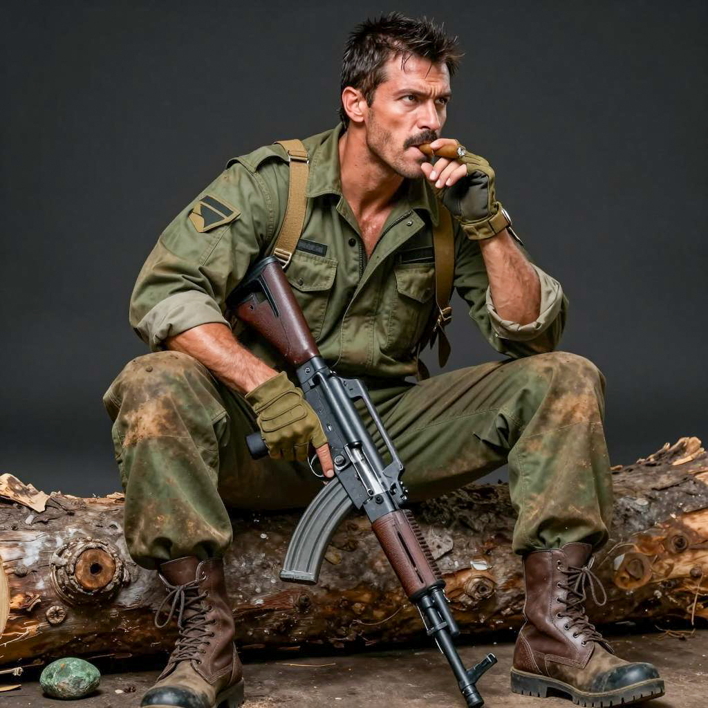 Photograph of a muscular man with short, dark, wet hair, sitting on a log. He wears a green military-style jacket, camo pants, brown boots, and fingerless gloves. He holds a black rifle across his lap with both hands. He has a cigar in his mouth and a serious expression. Dark background. A small rock is at the bottom left.