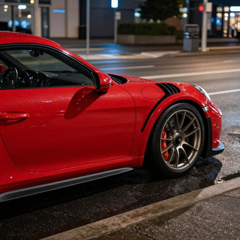 GT3 RS side view parked on an urban street at night, wet asphalt reflecting city lights, deep shadows highlighting muscular fenders, hyper-real detail, vivid red paint job