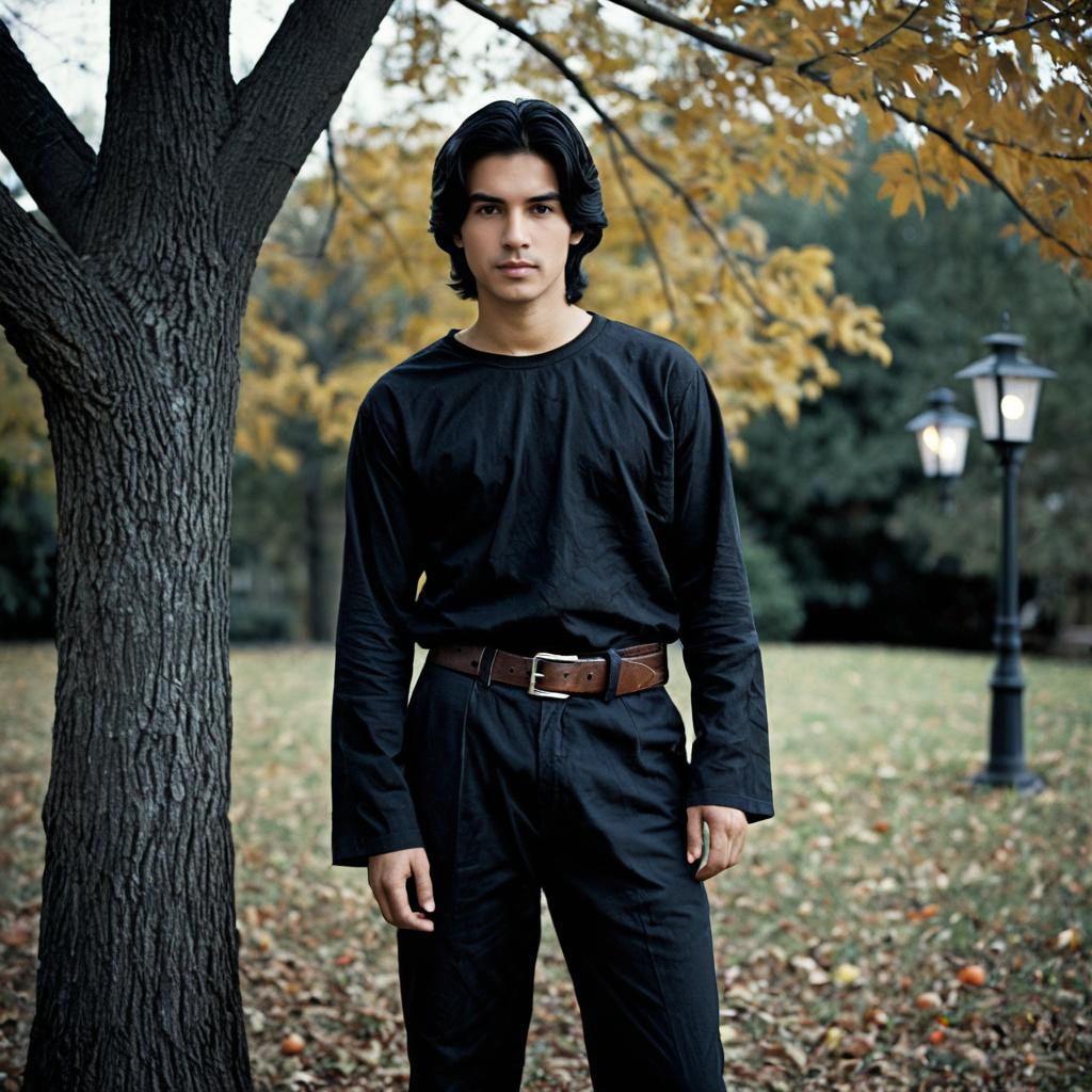 Portrait of a young man with black hair and black eyes standing outdoors. He is wearing a green long-sleeved collared shirt with red buttons, black pants, and a red belt with a silver buckle. The background is blurred with trees and natural greenery, and the man is looking directly at the camera with neutral expression.