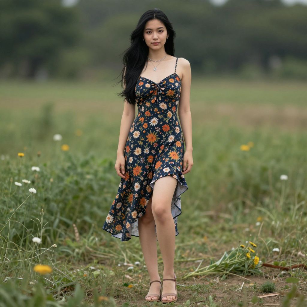 Photograph of an Asian woman with long black hair, wearing a floral sundress with a thigh-high slit, standing in a grassy field with scattered