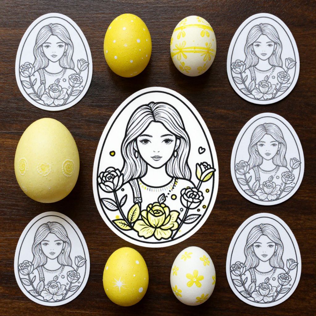 Stickers depicting a woman, roses and other flowers, on white and yellow eggs, of different sizes, easter egg coloring and decorating