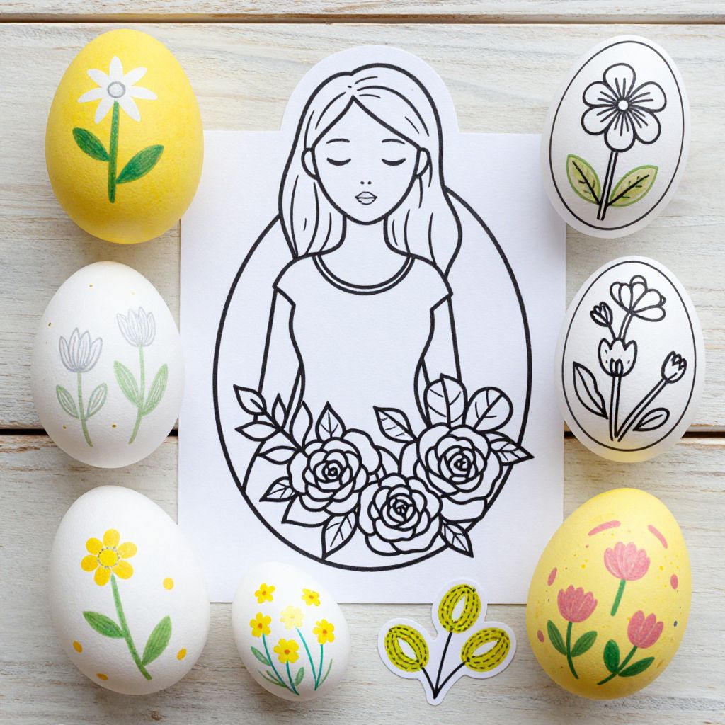 A photograph of a white wooden surface displaying a black-and-white line drawing of a woman with closed eyes, holding flowers, centrally placed on white paper. Surrounding the drawing are six decorated Easter eggs: three yellow with green stems and flowers, two white with yellow and green flowers, and one yellow with pink flowers. Additionally, there are small, detailed line drawings of flowers on three eggs. The eggs and drawing are evenly spaced, creating a balanced composition. The overall style is minimalist and whimsical.
