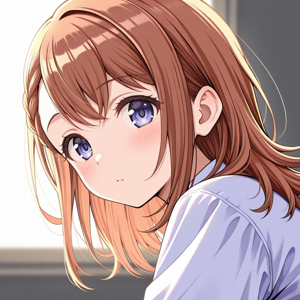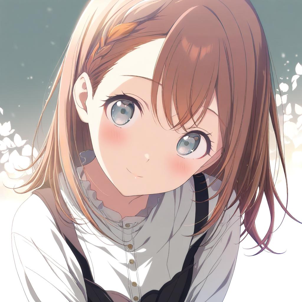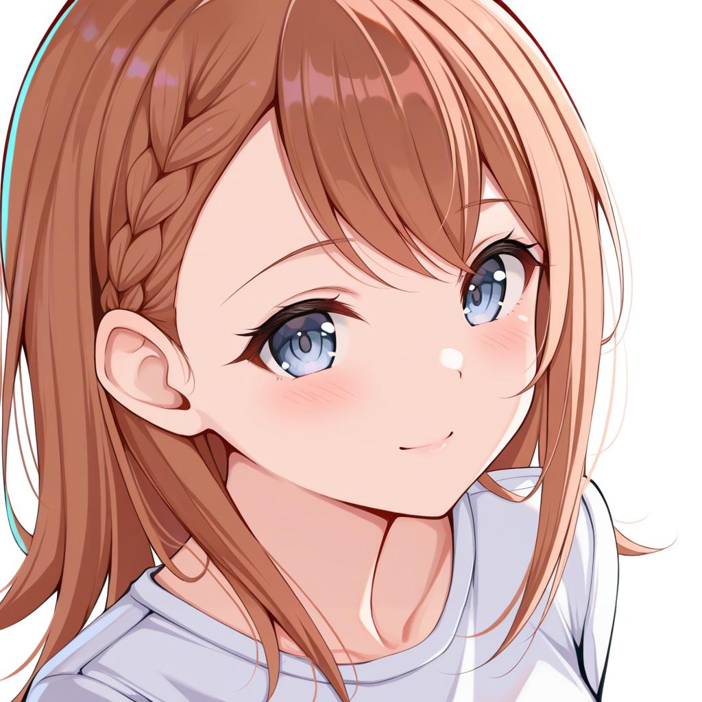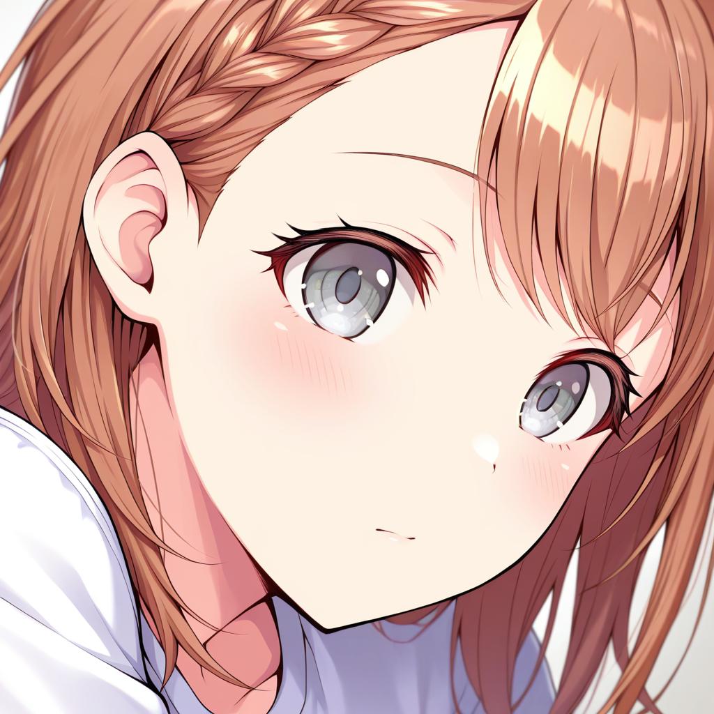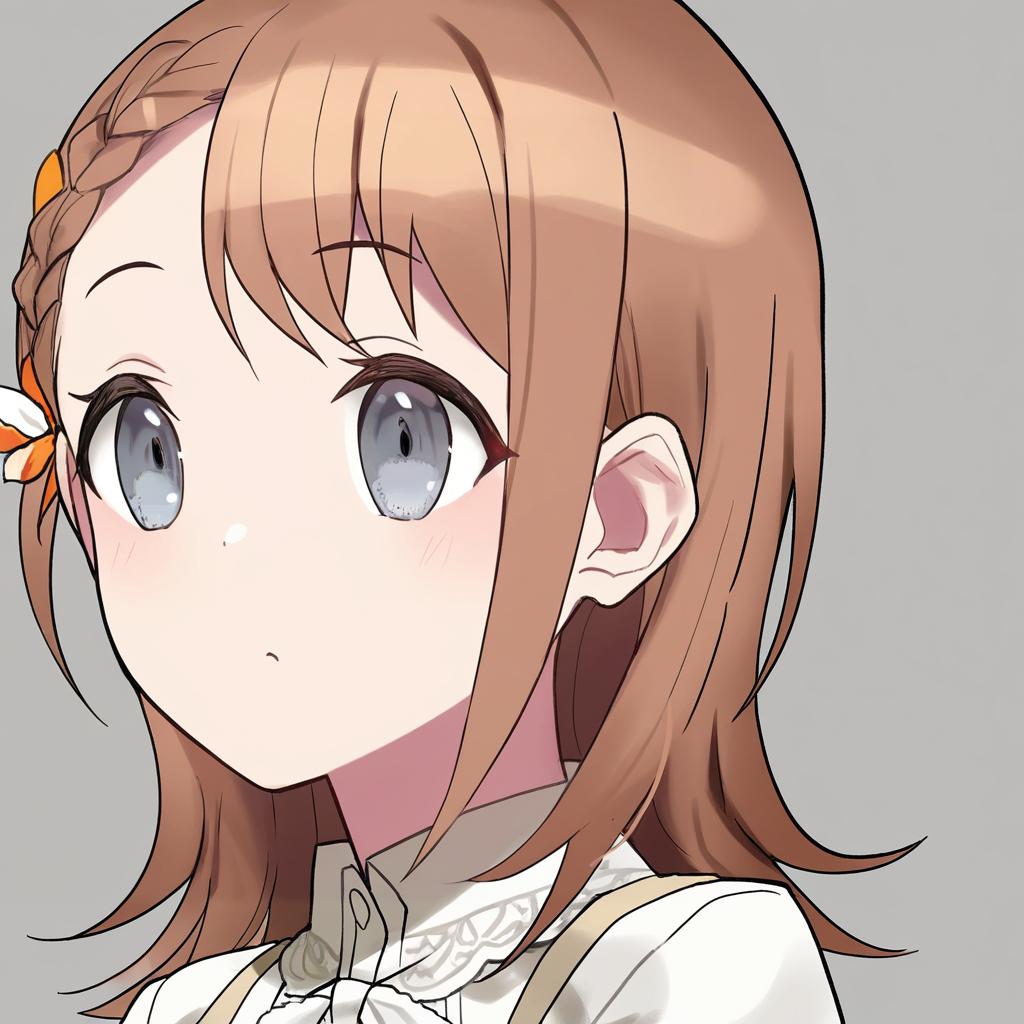 Hanasato minori, project sekai, 1girl, hair behind ear, grey eyes, eyelashes, brown hair, medium hair, long hair, swept bangs, braid, white shirt, dot nose, tareme, by artist kimishima ao, leet