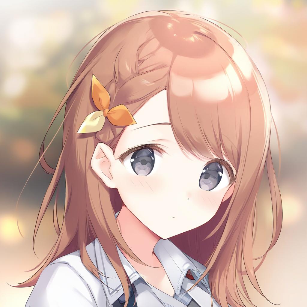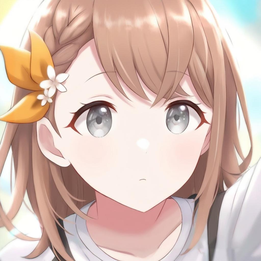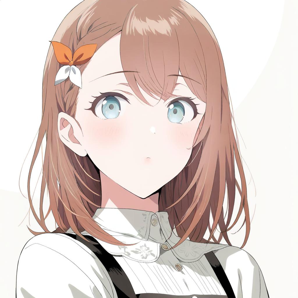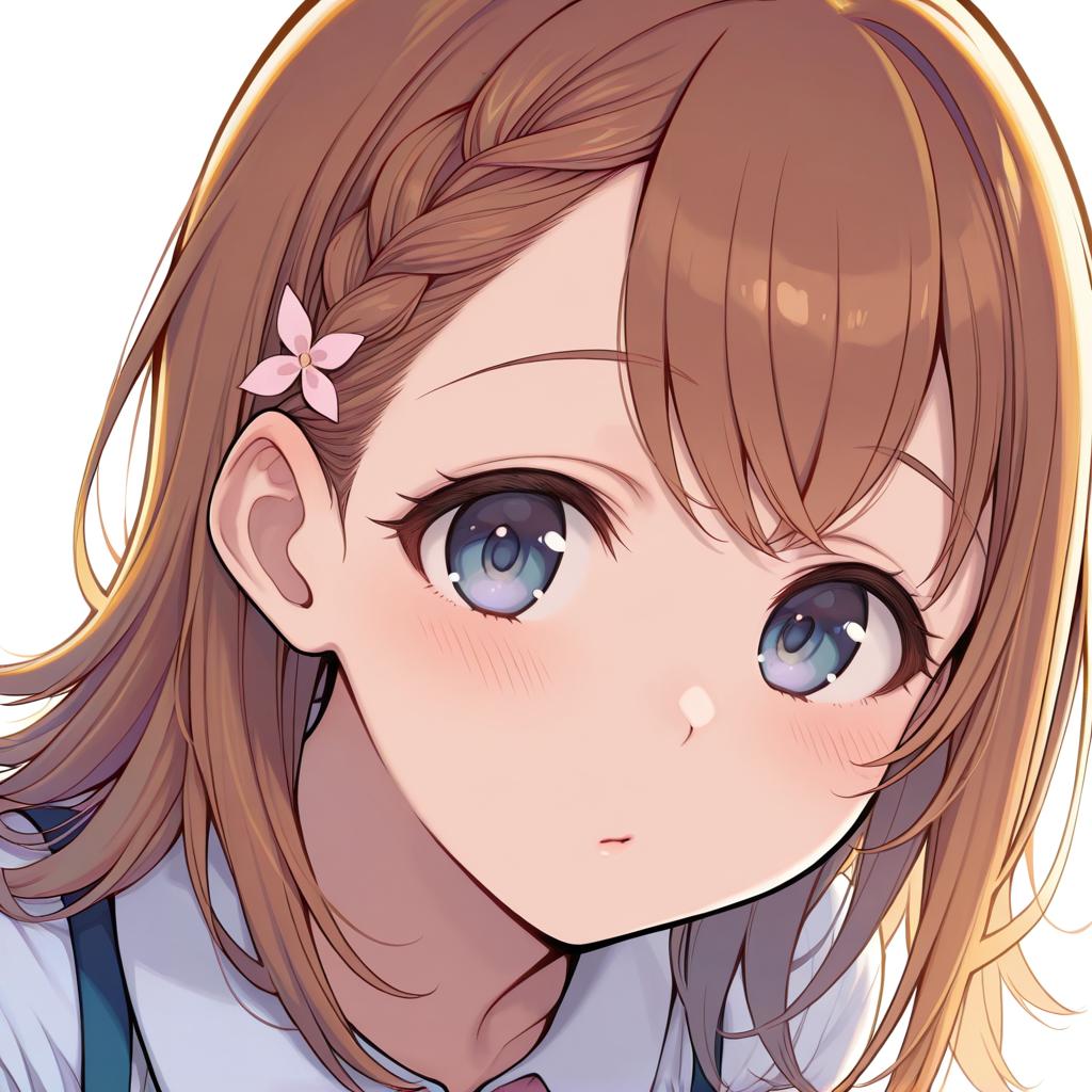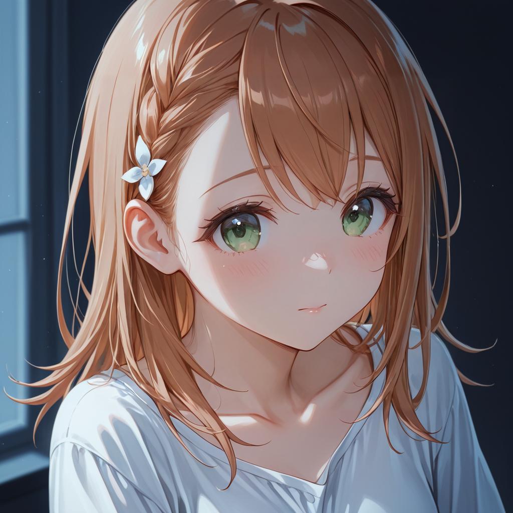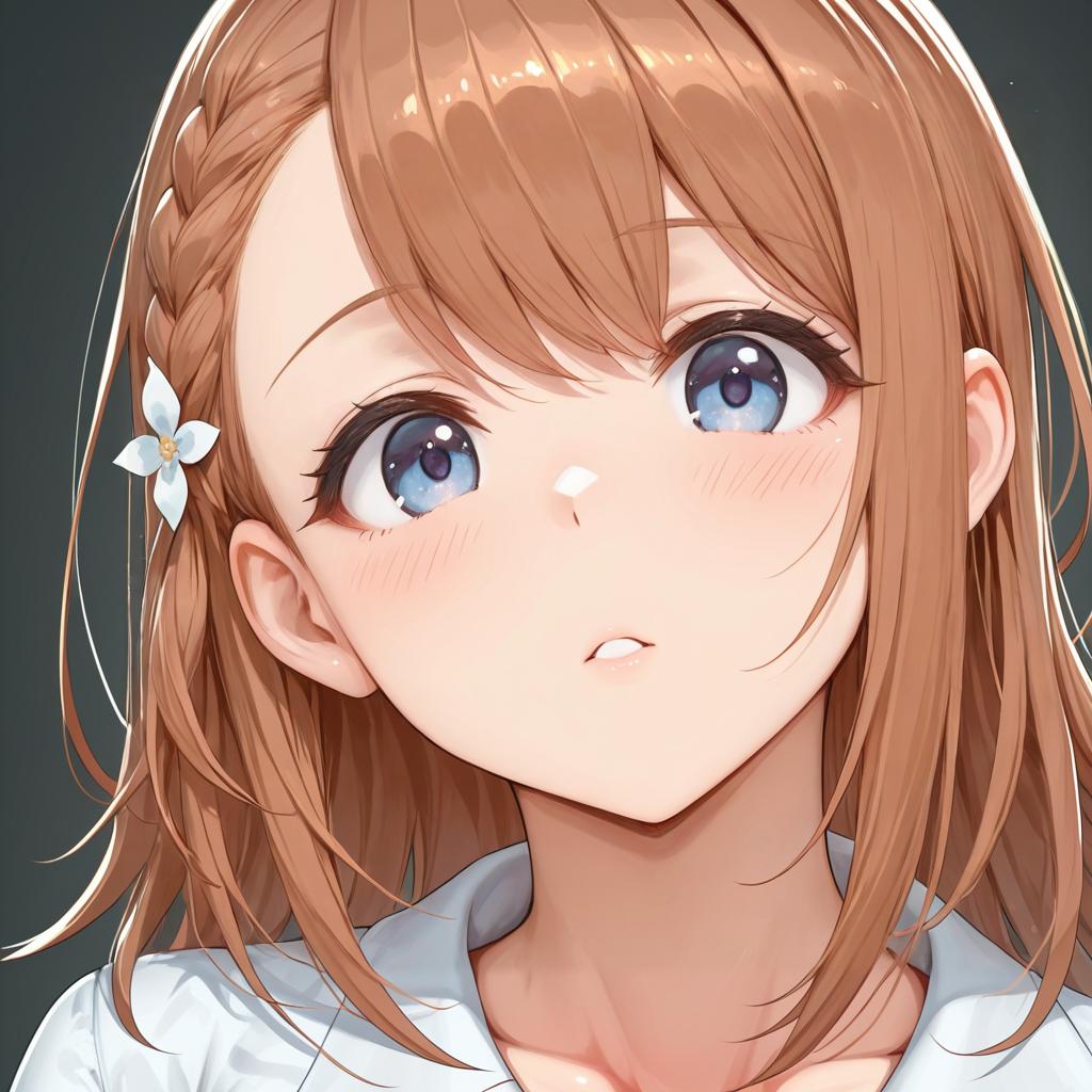 Hanasato minori, project sekai, 1girl, hair behind ear, grey eyes, eyelashes, brown hair, medium hair, long hair, swept bangs, braid, white shirt, dot nose, tareme, by artist kimishima ao, leet