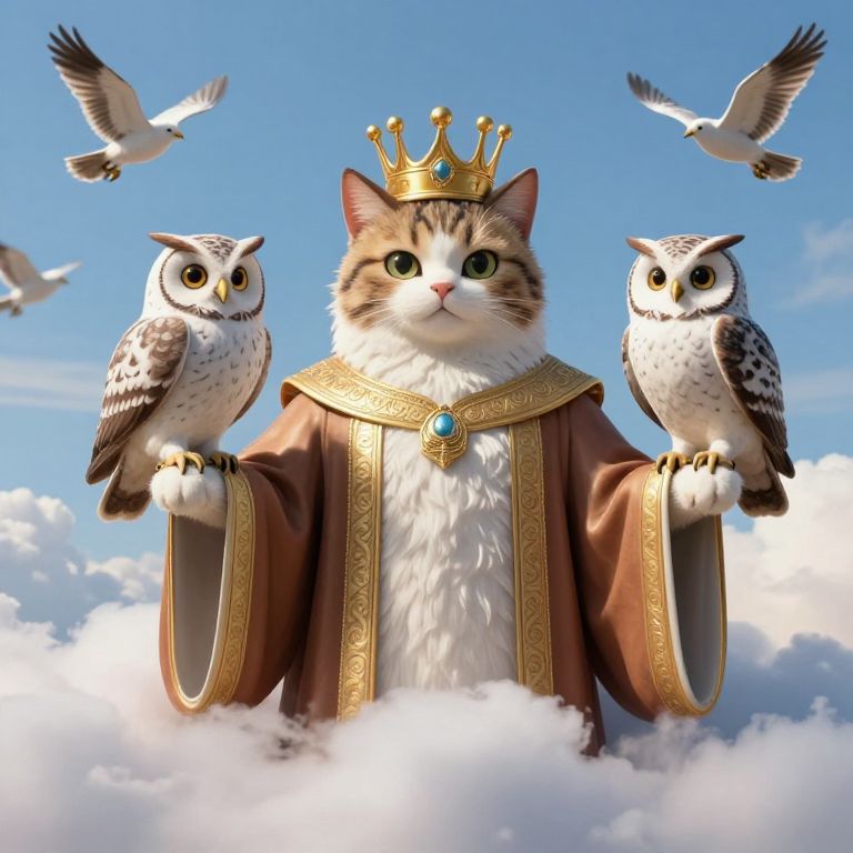 Feline Emperor reigns majestically amidst the clouds, flanked by three judicial-devoted owls perched on his arms, as birds soar gracefully in the sky above.