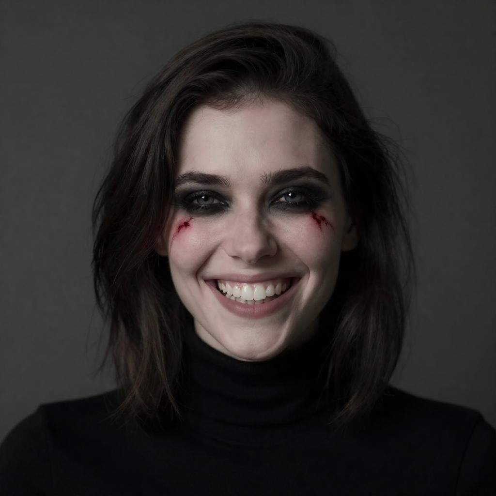 Photograph of a woman with pale skin, dark brown shoulder-length hair, and intense expression. She has black eye makeup and red scratches on her cheeks. She is smiling widely, showing sharp teeth. She wears a black turtleneck. Background is blurred and dark. She is centered in the frame.
