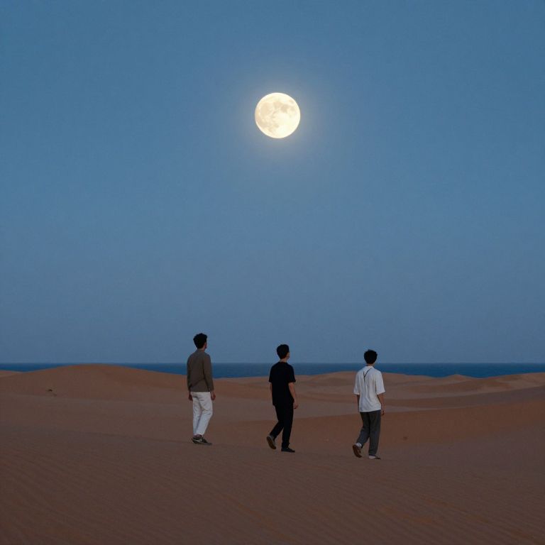 Photograph of three men walking in a vast, reddish desert under a twilight blue sky. The bright full moon, centered in the sky, casts a soft glow. The men, in dark and white clothing, are positioned from left to right, facing away. Their silhouettes are distinct against the sandy dunes in the background. The men's clothing includes white trousers and dark shirts, with one man in a white shirt on the right. The texture of the sand is visible, and the horizon is slightly blurred. The overall mood is serene and contemplative.