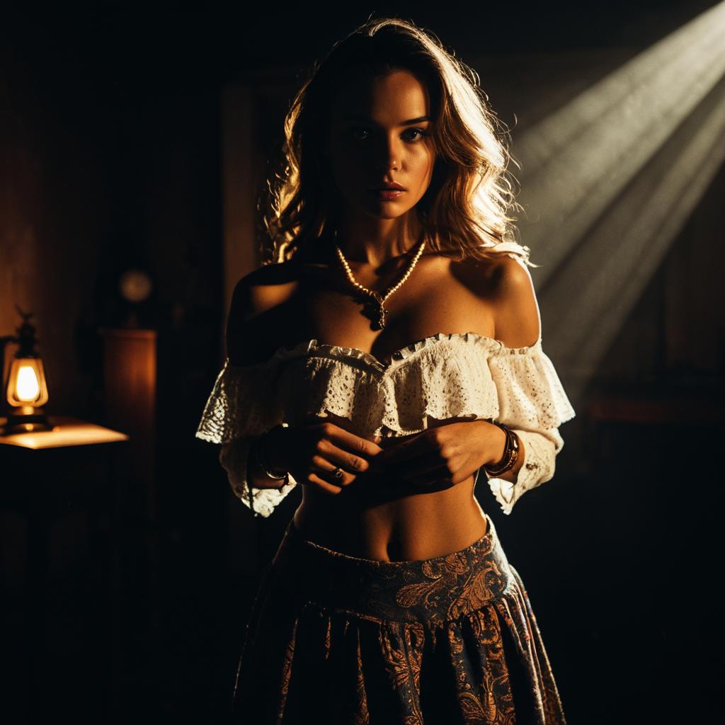 Photorealistic portrait of a woman with light brown skin and wavy hair, wearing an ivory off-shoulder cropped lace top with delicate ruffle detailing and a statement necklace. The image features dramatic, soft cinematic lighting casting shadows and highlights on her face and shoulders, set against a dark background with a single lamp illuminating the scene.