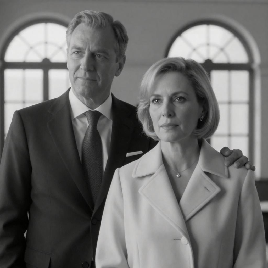 Black and white photograph of a man and woman. Man with short, gray hair, dark suit, white shirt, tie, and pocket square, stands behind the woman. Woman with short, blonde hair, light-colored coat, looks slightly to the side. Man's arm around woman's shoulders. Background with arched windows. Intense man's expression, neutral woman's expression.