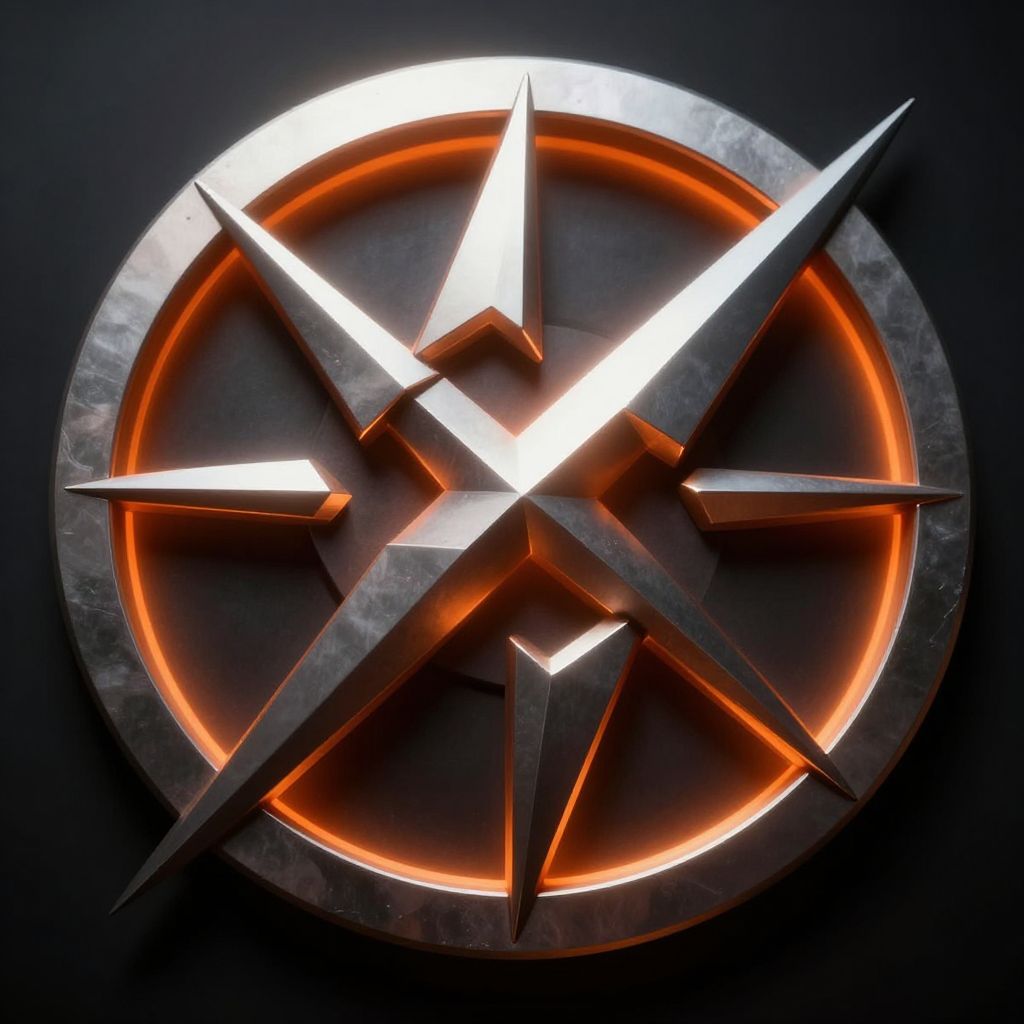 Close-up of a futuristic abstract metallic emblem featuring sharp, angular shapes and intricate detailing. The emblem is circular with intersecting pointed elements and illuminated by a warm orange glow from within, set against a dark background.